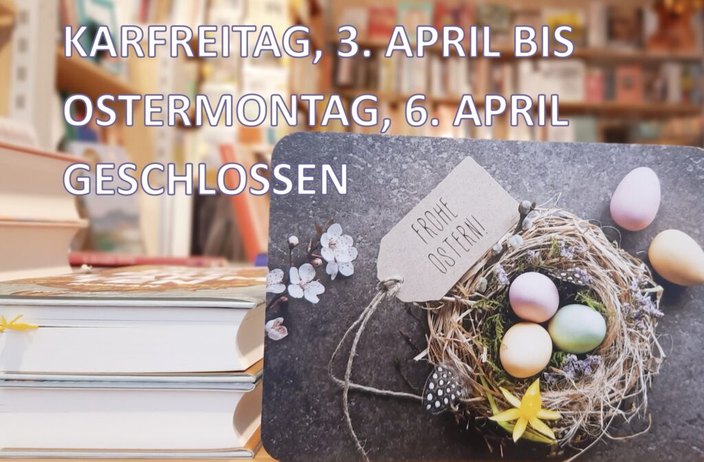 Vom Karfreitag, 3. April bis Ostermontag, 6. April ist die Buchhandlung geschlossen. Ab Dienstag, 7. April sind wir wieder für Sie da.